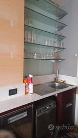 Bancone bar del 2012 costruito da artigiani, 2 frighi statici + 1 ventilato tutti con motore esterno (da cambiare causa cambiamento regolamenti gas) retrobanco con lavandino. Top in corian (in alcune parti rovinato ma sistemabile.