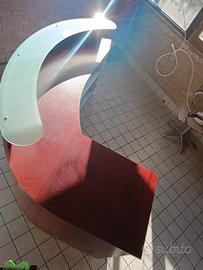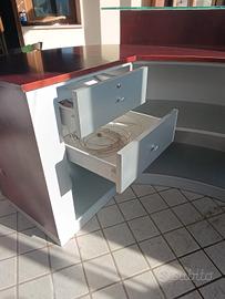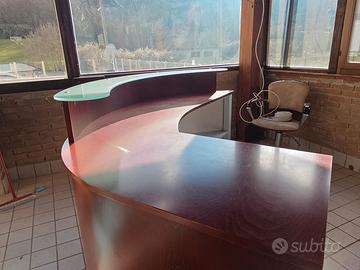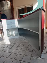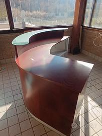 Bancone cassa in legno massello lavorazione artigianale ,esternamente inpellicciato con lastre di legno colore mogano scuro.internamente, inpellicciato grigio argento.mensola in doppio vetro satinato molto resistente 2 cassetti. semicircolare, misura m 2 x 1,35. Visibile previo appuntamento.Trasporto a carico dell'acquirente