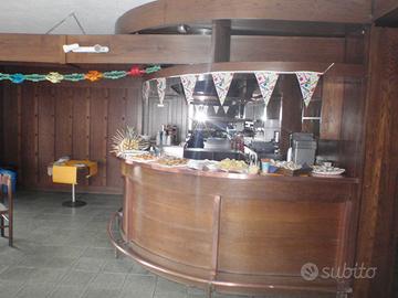 Vendo bancone semitondo, completo bar con frigoriferi funzionanti, bottigliera, ripiani vari, lavandino. Il banco e il poggiapiedi sono in rame, mentre il rivestimento è in legno.