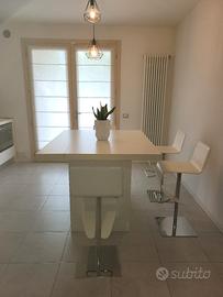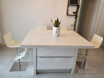 Vendo tavolo / bancone (90 x 140 cm, altezza 93,5 cm) completo di n. 2 cassettoni su misura estraibili con ruote e n. 4 sgabelli 100% Made in Italy con comoda seduta in cuoio color bianco e base in acciaio cromato.