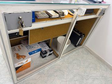 Vendo Bancone Bianco Brillantinato con Piano Effetto marmo per Attività Commerciale con Vetrina a due Ante con Serratura, Luci, due Cassetti con Chiave e con ampio sottobanco anch’ esso illuminato.