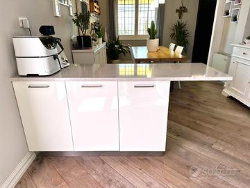 Bancone cucina in legno bianco, mobile in ldotato di tre comodi sportellicon ripiani all’interno, piano in quarzo resistente a tutto. Misure del mobile 135*37, il piano misura 185*65. Altezza totale 87. Praticambete come nuovo.