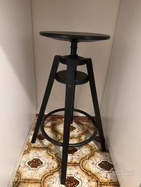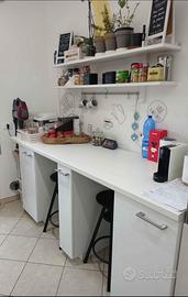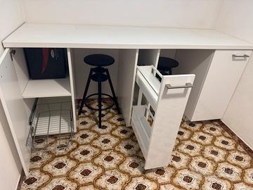 Bancone da cucina di 1 anno di vita, con due vani in cui sono nascosti i 2 sgabelli neri ad altezza regolabile, cosi da poter usare il ripiano anche cone tavolo da pranzo. Il mobile è composto da 2 ante e un carrello centrale portaspezie.