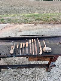 Vendo bancone da falegname antico, interamente fatto a mano in legno massello. Dimensioni Lunghezza: 2 m. Larghezza: 60cm. Altezza: 80 cm. In buone condizioni generali. Fornito di morsa funzionante, presenti anche alcuni attrezzi originali del epoca.