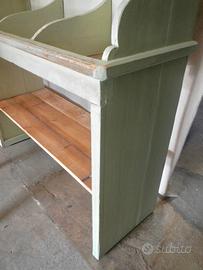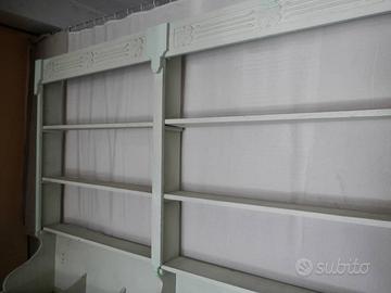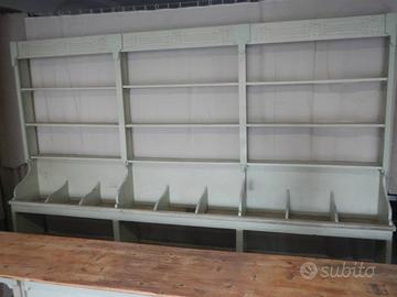 Bancone e retro banco di negozio cartoleria in abete colorato verde. Il bancone misura cm 380×58 h93 ed e composto da 3 cassetti. 2 vani con mensole un vano chiuso con porte e vetro. All’interno cassetto segreto. Il retro misura cm 364×46 h258. La parte alte e smontabile in 2 pezzi con una sbarra di ferro che li tiene uniti.Con 8 mensole. La parte superiore è intagliata con disegno Completamente restaurato e lasciato in patina.