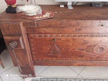 Bancone da falegname in olmo con chiusura frontale laterale di pannello intarsiato, con spazio interno supplementare, in condizioni perfette, adatto anche a salone hotel per banco colazione oppure come isola centrale in una grande cucina. Dimensioni 263x67. Una madia solo con pannello di legno vero stesse dimensioni costa la stessa cifra senza alcuna decorazione artistica