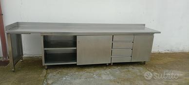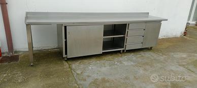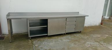 banco in acciaio inox con vari moduli come da foto misure 3,20 MT * 70 cm di profondità per 85 cm di altezza uso ristorazione professionale il banco si smonta il piano sopra e i due elementi sotto visibile ritiro a Casei Gerola da lunedì a domenica non solo su appuntamento possibilità di avere la fattura allo stesso prezzo disponibili per cessata attività altri banche in acciaio aperti e chiusi pensili e lavelli e altro ancora pentolame e posateria