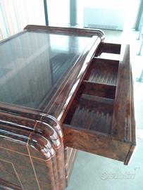 Mobile completamente rivestito in radica di noce con verniciatura a specchio in poliestere,