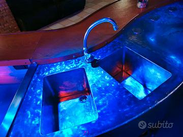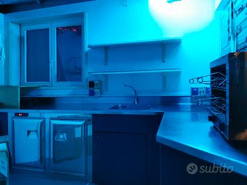 - Piani di lavoro e lavandini in acciaio sia sul bancone che nel retro.
