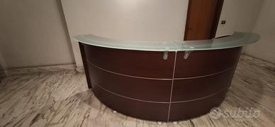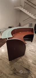 Vendo per cessata attività bancone reception circolare, marca "Dalla Rovere" realizzato con due moduli curvati a 60° con pannelli frontali in melaminico spessore 16 mm., piani di lavoro in melaminico color noce spessore 25 mm e top in vetro temperato spessore 12 mm., in ottime condizioni!