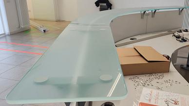 Bancone reception curvo, usato ma in ottimo stato, legno melaminico color grigio chiaro con top in vetro, completo di fori passacavi. Ingombro: 300 cm di lunghezza x 73 cm di profondità x 73 cm di altezza. Solo ritiro in loco