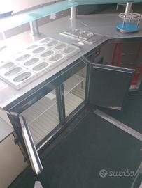Il bancone è angolare e modulare, composto da due frigoriferi + scaldavivande + sportelli armadiati