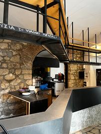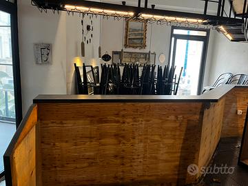 Metri 4 di bancone in multistrato marino trattato rivestito con grès porcellanato effetto corten con canalette luminose che risaltano la parte bassa del bancone abbianato con traliccio di uguale misura e forma in ferro tratto con portabicchieri e secondo ripiao in legno