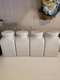 Quattro barattoli per la cucina, in ceramica, con frutta in rilievo. Hanno chiusura ermetica. Utilizzati per zucchero, sale, pasta. In ottimo stato. Prezzo per tutto il set. Vendibili anche singolarmente. 5 euro per un solo barattolo. 9 euro per due. 12 euro per tre. Non si rovineranno mai. Io li ho da tanti anni. A Rozzano. Tel 3402486230