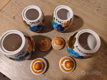 Vendo set da 4 barattoli in ceramica dipinta a mano con scritte: Zucchero, Spezie, Thè, Sale