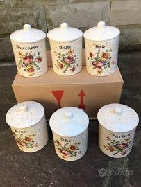 Vendo, in perfette condizioni e mai utilizzati, sei barattoli con coperchio in ceramica decorata marchiati Made in Italy, con scritte e decori fioriti nella parte frontale e decori fiorellino anche sul retro di ogni pezzo, come foto...