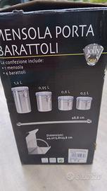 La confezione comprende: barra di fissaggio, mensola, 4 barattoli con chiusura ermetica e diversa capienza.