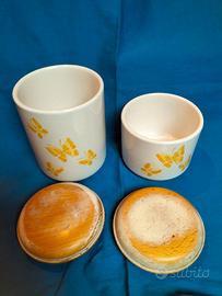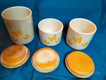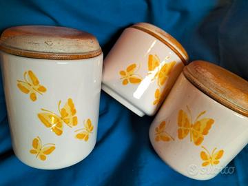 Set di tre barattoli da cucina porta zucchero, sale e caffè con decorazione a farfalle. Realizzati in ceramica bianca con coperchi in legno un po' scoloriti, come da fotografie. Design con farfalle gialle. Le dimensioni si riferiscono ad un solo barattolo e le musure di larghezza 7 cm. e di fondo, sempre 7 cm. devono intendersi di circonferenza. L'insieme dei tre barattoli mantiene l'altezza massima di 10 cm. ed il fondo di 7 cm. mentre la larghezza diventa di 45 cm.
