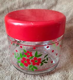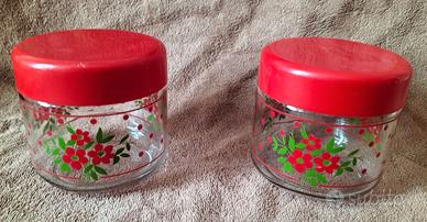 Set di due contenitori da cucina con coperchio rosso e decorazione floreale. Ideali per caffè, zucchero o sale. Realizzati in vetro con coperchio in plastica.