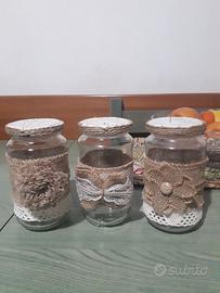 Barattoli decorati a mano con passamaneria, yuta, pizzi, merletti e fiocchi, reciclo di marmellate, sughi, e sottolio, di utilizzo vario. Si possono usare come vasi, centrotavola, portapenne o pellnnellu, portacioccolatini o caramelle. Il prezzo è indicativo al pezzo.