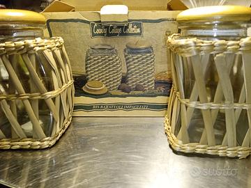 2 barattoli impagliati. Nuovi nella scatola originale. Country Cottage Collection. Altezza 15 cm x larghezza 10 cm x profondità 8 cm.