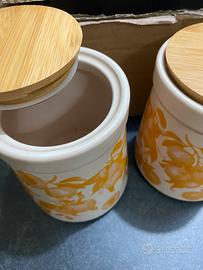 3 barattoli x 12€ 1 x 5€ Eleganti barattoli in ceramica con un allegro decoro di frutta gialla. Il coperchio è in legno. - Design con frutta.