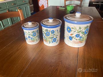 3 barattoli in ceramica con coperchio da jg, mezzo kg e 200gr con decoro floreale bianco e . Piccolissima scheggiatura sul bordo del secondo barattolo