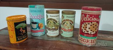Vendo barattoli in latta, retrò, come foto. Nello specifico trattasi di 2 barattoli Pernigotti, 1 della cioccolateria Zaini e 2 generico da colazione. Multicolorati e intatti