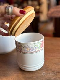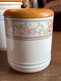 Set da cucina in porcellana composto da una biscottiera e da due barattoli, tutti con coperchi in legno. Porcellane Mirabell 18 euro il set