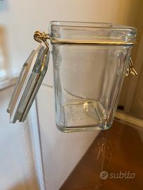 Barattolo quadrangolare in vetro a chiusura ermetica con guarnizione in gomma per alimenti.