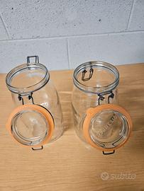 Vendo n. 2 barattoli in vetro trasparente di forma rotonda da litri 2 con pratica chiusura rapida. Composto da parte inferiore in vetro, tappo in vetro, anello in gomma colore rosso e chiusura con staffa metallica. Facile da aprire e chiudere senza alcun sforzo. Il contenuto del barattolo si conserva fresco ed a lungo grazie alla guarnizione in gomma.