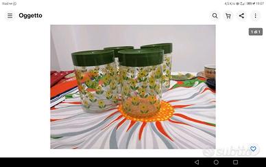 Quattro Barattoli cucina in vetro decorato, con coperchio. Vintage