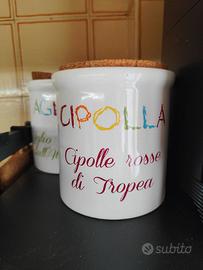 N° 6 Barattoli di ceramica in blocco di Villa d'Este stile rainbow con tappo di sughero in buono stato e di varie grandezze - Sale - Zucchero - Caffè - Peperoncino (più piccolo) - Cipolla (più grande) - Aglio Vendo in blocco