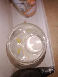 barattolo di vetro , tappo di vetro , contenitore per la farina , disegnato un mulino . vintage anni 79