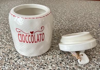 Vendo barattolo da cucina/dispensa in ceramica bianca con scritta e dettagli rossi, ad uso alimentare, guarnizione ermetica sul tappo, lavabile in lavastoviglie, nuovo mai utilizzato.