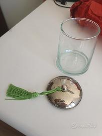 Barattolo in vetro con tappo silver plate nuovo Misure altezza 9 cm (senza tappo), larghezza 6,5 cm in cima e 7 alla base