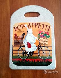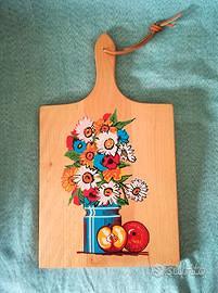 Vendo infine tagliere in legno vintage, con disegno decorativo e laccetto, da usare anche come decoro da parete, in perfette condizioni. Misure: lunghezza 39,5 cm (compreso il manico); larghezza 23 cm; spessore 1,5 cm. Prezzo 7 euro.