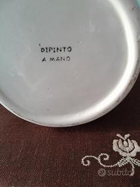 Il fondo del barattolo reca la dicitura "DIPINTO A MANO", a conferma di una decorazione eseguita artigianalmente a pennello con ricche volute floreali in blu cobalto e ocra.
