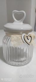 Bellissimo barattolo di vetro, ideale per conservare piccoli oggetti o come elemento decorativo. Ha un coperchio in ceramica bianca e un nastro in pizzo con un cuore decorativo in legno. - Coperchio in ceramica.