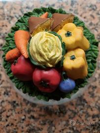 Barattolo in vetro, tappo in sughero con decorazione di ortaggi. H 17,5 cm, circonferenza 17 cm. Nuovo. Ritiro in sede zona Pavia.