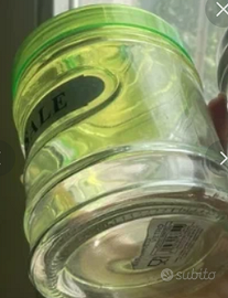 Barattalo grande in vetro con tappo in plastica verde e davanti targhetta argento con scritta “SALE” in nero