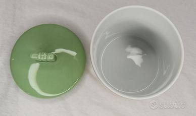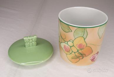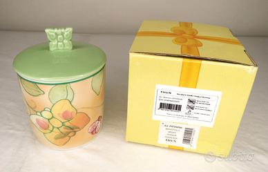 Linea Pasqua Favolosa. Altezza circa 14 cm con coperchio. Diametro 11 cm. Capacità circa 900 ml. Coperchio con pomolo decorativo a forma di coccinella.