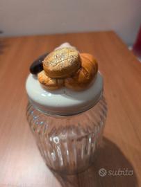 Barattolo portadolci in vetro e coperchio con chiusura ermetica decorato in ceramica. Misura circa 10 cm diametro e h 17