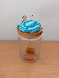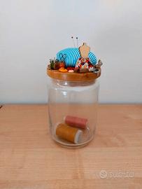 Barattolo in vetro, tema cucito, utile per riporre rocchetti di filo, forbici e quanto altro.