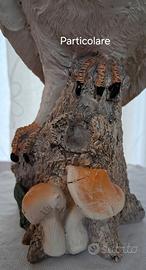 Potrebbe sembrare una civetta ma si tratta di un barbagianni (Tyto alba), in resina, posato su un ceppo d'albero con piccoli funghi e una foglia alla base.