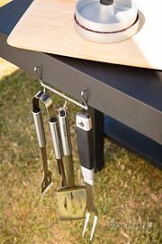 Barbecue a carbonella Centaurus Beta. In acciaio smaltato nero con coperchio con termometro, 2 griglie di cottura, cassetto per smaltimento della cenere, mensola con ganci per gli utensili da cucina, apribottiglia e tavolino laterale.