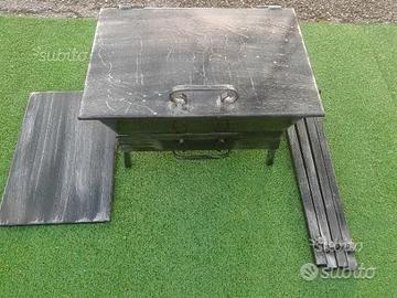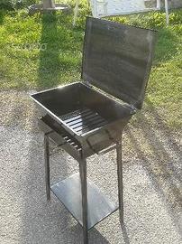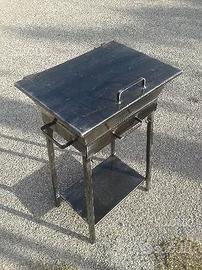 Fornacella/barbecue artigianale in ferro battuto ideale per chi dispone di piccoli spazi. Realizzata a mano con lamiera da ben mm. 2, è robusta e resistente ma agilmente trasportabile. I piedi, di dimensione mm. 20x20, sono realizzati in tubolare di spessore mm. 3 e sono facilmente smontabili. Il cassetto per la raccolta della cenere è estraibile. La fornacella è dotata di un coperchio apribile, una griglia porta carboni e un piano di appoggio inferiore smontabile. Disponibile in nero con patinatura argento oppure esclusivamente in nero, la fornacella si intende esclusa di griglia per arrosti. Dimensioni: