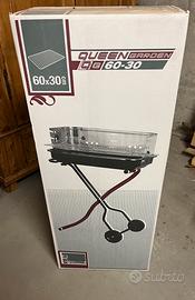 Nuovo. Ancora imballato. Mod Queen Garden 60x30. Struttura portante con ruote dal diametro di 155mm. Cappa paravento in acciaio inox con bordo di sicurezza antigraffio. Griglia cromata antigraffio con maniglie, regolabile in tre posizioni. Grata reggi carbone in lamiera alluminata. Gambe ripiegabili.