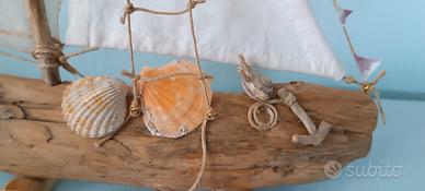 Manufatto artistico realizzato con legno di mare (trattato e sanificato), conchiglie di pregio, vele in cotone cucite su misura, funi e scaletta in spago naturale, àncora in legno sempre di recupero, timone a chiocciola.