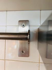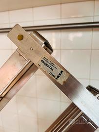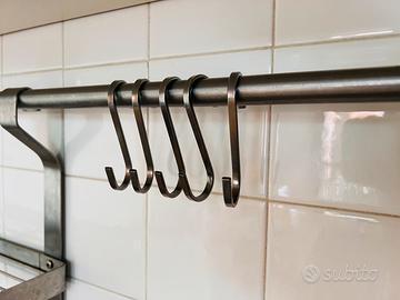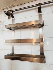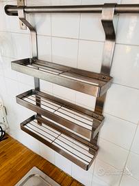 Marca IKEA Modello Grundtal 15386 (fuori serie) Articolo vintage anni 2000 Materiale acciaio inox spazzolato resistente all’acqua Si monta semplicemente con due viti su qualsiasi sostegno Composto da: - 3 mensole porta spezie o accessori cucina (scottex, spugnette, sapone piatti) il cui fondo è forato a grata per evitare ristagni di acqua - 5 ganci ad “S” liberi per mestoli e simili - 3 ganci a pinza per strofinacci Misure: Lunghezza sbarra: 80 cm circa Altezza complessiva 3 mensole: 43 cm circa Larghezza ciascuna mensola: 31 cm circa Profondità ciascuna mensola: 9 cm circa Utilizzato ma ancora in ottime condizioni; disponibile anche porta bicchieri sempre Ikea.